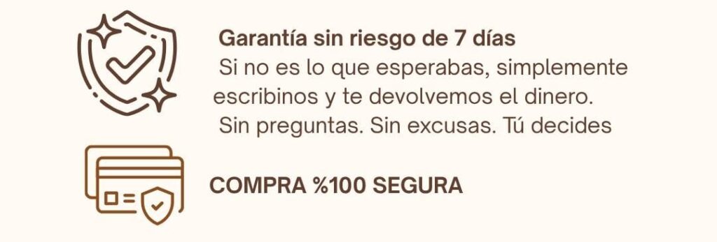 Si sientes que no es para ti o que no cumplió con tus expectativas, simplemente escríbenos y te devolvemos el 100% de tu dinero, sin preguntas ni complicaciones.